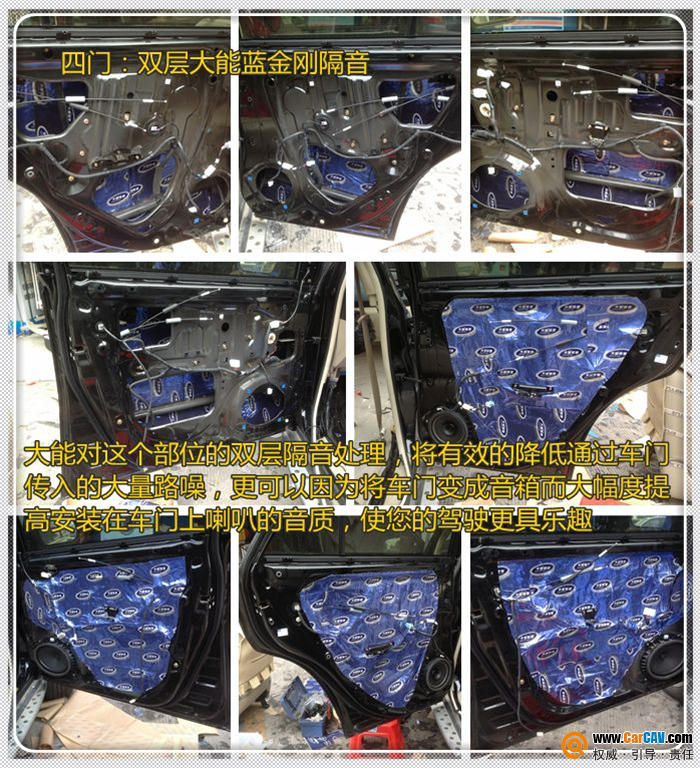 四门:双层大能蓝金刚隔音。四个车门为车内噪音的主要来源,大能对这个部位的双层隔音处理,将有效的降低通过车门传入的大量路噪,更可以因为将车门变成音箱而大幅度提高安装在车门上喇叭的音质,使您的驾驶更具乐趣。