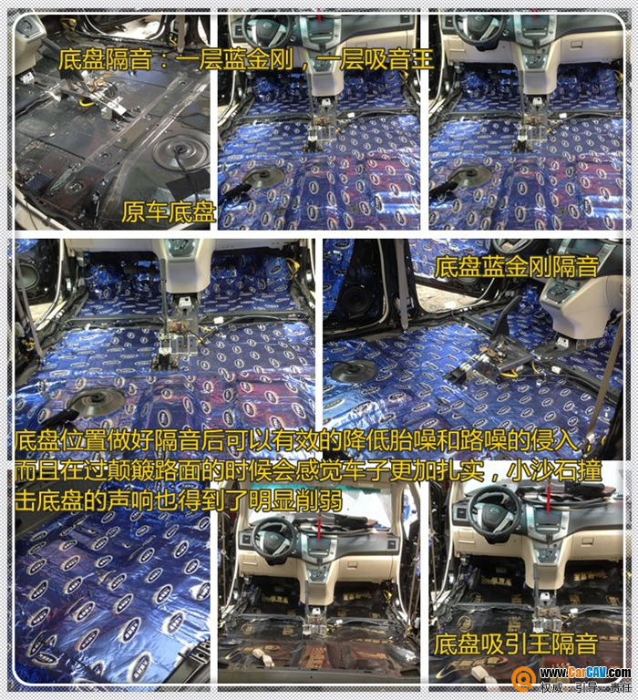 底盘隔音:一层蓝金刚,一层吸音王。底盘所承受的路面噪音超过了80分贝,大能隔音在底盘除了使用基本的一层顶级红标止振板外,还会再添加一层特制吸音王隔音材料,底盘位置做好隔音后可以有效的降低胎噪和路噪的侵入,而且在过颠簸路面的时候会感觉车子更加扎实,小沙石撞击底盘的声响也得到了明显削弱。