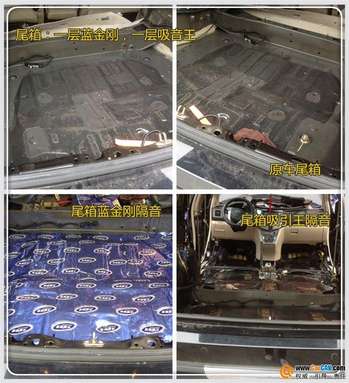 尾箱:一层蓝金刚,一层吸音王。后备箱位置容易受到胎噪、路噪和尾排噪音的侵入,大能城市精英隔音套餐,针对后尾盖使用红标搭配超蓝金刚,吸音王,吸音隔热阻隔噪音传播。做好隔音后可以有效的降低这三方面带来的噪音,而且可以降低低音部分带来的低频共振噪音,为以后升级音响添加低音部分打好了基础,可以说是一举多得。