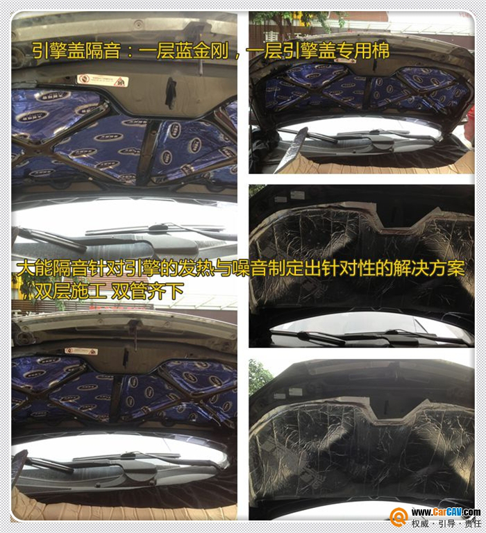 引擎盖隔音:一层蓝金刚,一层引擎盖专用棉。发动机(引擎俗称"机头")噪音超过90分贝,排气温度超过300度,直接导致空调能耗大,引擎盖漆面老化过快以及难以忍受的发动机轰鸣声,大能隔音针对引擎的发热与噪音制定出针对性的解决方案,双层施工 双管齐下,第一层大能蓝金刚,贴完一层蓝金刚之后能有效的降低钣金共振,抑制噪音传播。针对发动机仓的高热量,使用一层引擎盖专用棉,吸音隔音双重功效。