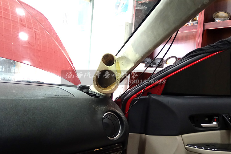超强改装,在汽车A柱上安装改装喇叭,当然图片所示只是雏形,还要进行加固,然后进行包裹皮质,安装喇叭,难度非常大的