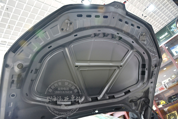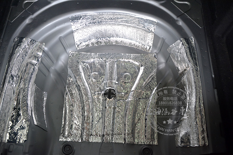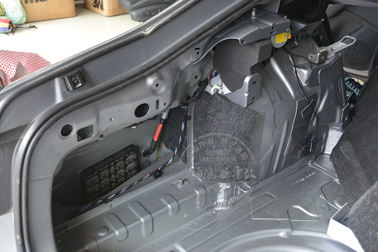 汽车的尾箱,在取出备胎后,在内部的钣金表面粘贴大量的3M止震板,可以有效减少行车过程产生的声音震动,减少噪音!