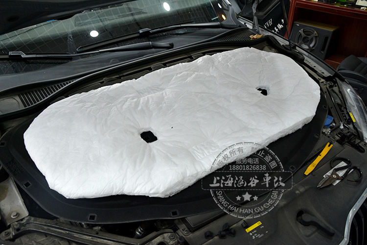 根据发动机挡板,进行裁剪3M新雪丽隔音棉,根据所需要预留的空洞位置进行裁剪,然后与挡板用3M隔音专用双面胶进行固定