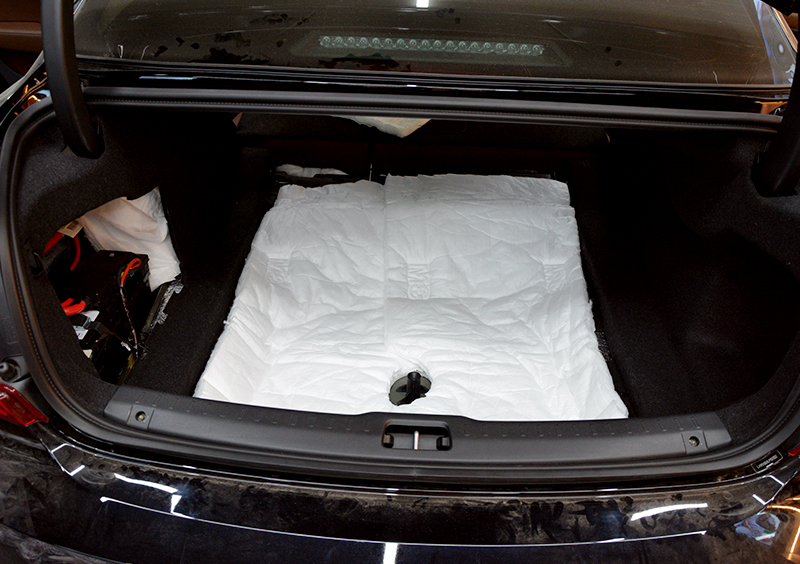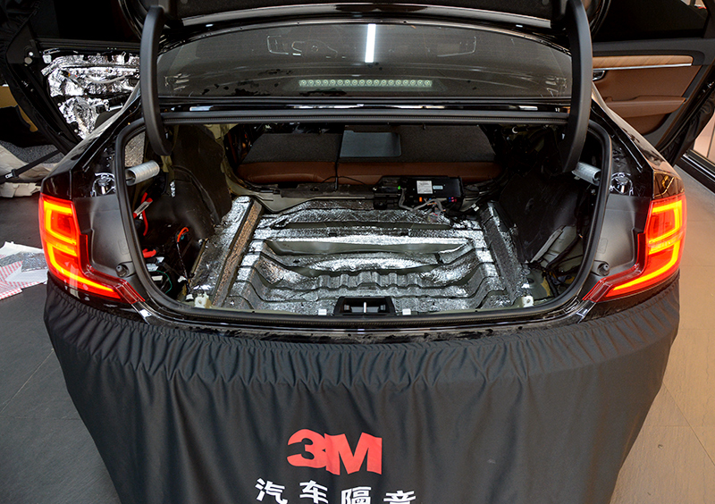 尾箱隔音处理——解决沃尔沃S90的风噪问题,尾箱隔音解决方案:一层3M隔音材料,一层3M吸音棉。包括尾箱底板钣金、尾箱两侧轮弧在内,也需要进行隔音处理。尾箱双层隔音处理之后,来自尾箱的低频共鸣噪音、胎噪和共振噪音明显变小。
