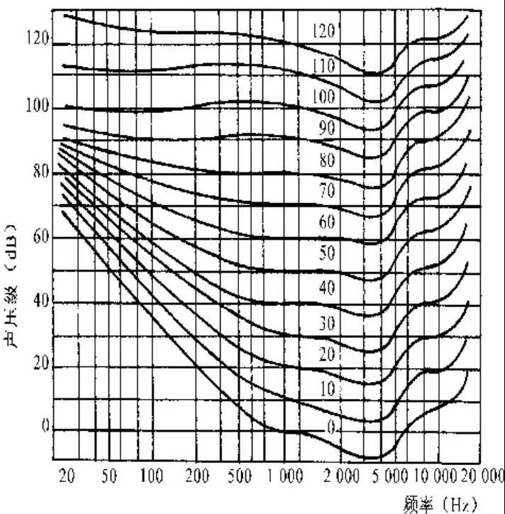 (1)人耳对3~4 kHz频率范围内的声音响度感觉最灵敏。人耳对低频和高频声音的灵敏度都要降低。