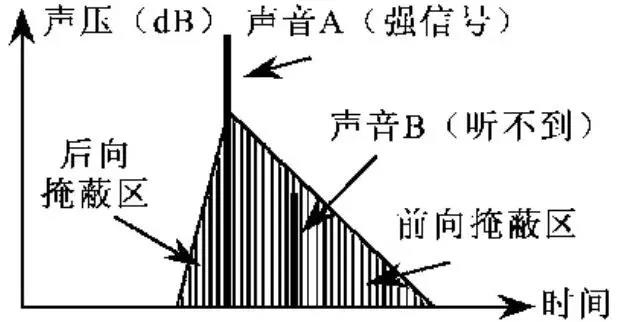 (2)时域掩蔽。是指在时间上,一个强信号会掩蔽掉前后一段时间内较弱的声音,使之不能被听到。